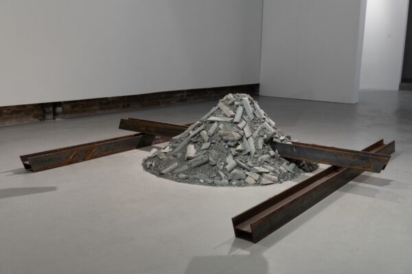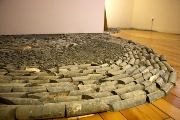 Rocks are evidence of location, space: the conglomeration of water, shifting tectonic plates, humanity’s ruffling and silt sifted through rivers with time to harden. The rock removal through mining was displacement. The remaining holes marked irreplaceable land, like caterpillar bites through an oak leaf. These particular cores represented the agony of exploited expectation, vacant defeat and irreplaceable resources. These mined rocks were housed from the initial sampling of the land as resting artifacts of decades of speculation.