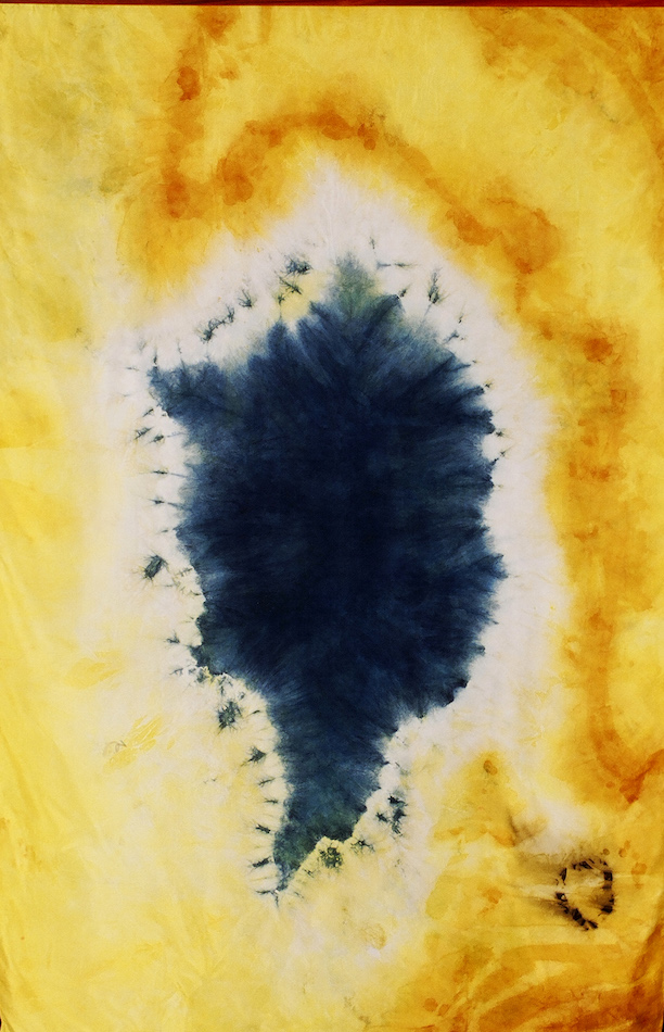 I gaze into the dye pot and silently repeat my mantra "molecules in motion” as pigment is being extracted from plants, bugs, or mud, and dissolve in water. The water starts out cool, clear, and clean. The cloth (cotton, wool or silk; shiny or matte; sheer or opaque) has been bound so that some areas will absorb pigment, while other sections will be untouched. Heat is applied. Complex color develops in the water and over time transfers to the cloth. Binding cloth takes kinesthetic strength. Dyeing bound cloth results in patterns. My designs are inspired by the meandering curves of the ever changing river bank and the invisible paths leaves take as they fall to the ground, influenced by wind currents.