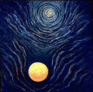 The story evolved from the many paintings of the planet as imagined in different times - from its birth - through fire, floods, growth, life and potential death. Many of my images are cosmic in nature and are manifestations of meditations on creation and change.