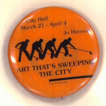 Hanson came to prominence early in the 1970's, soon after she moved into a deteriorated but stately Victorian on Buchanan Street. Once she had resuscitated the house into a landmark, she tackled its windy litter-strewn sidewalk. Her personal act of sweeping one sidewalk grew into a celebrated public art practice and citywide anti-litter campaign. Her compiled volumes of urban detritus are recognized as an artistic political tour de force that raised community awareness as it chronicled rapidly changing demographics.