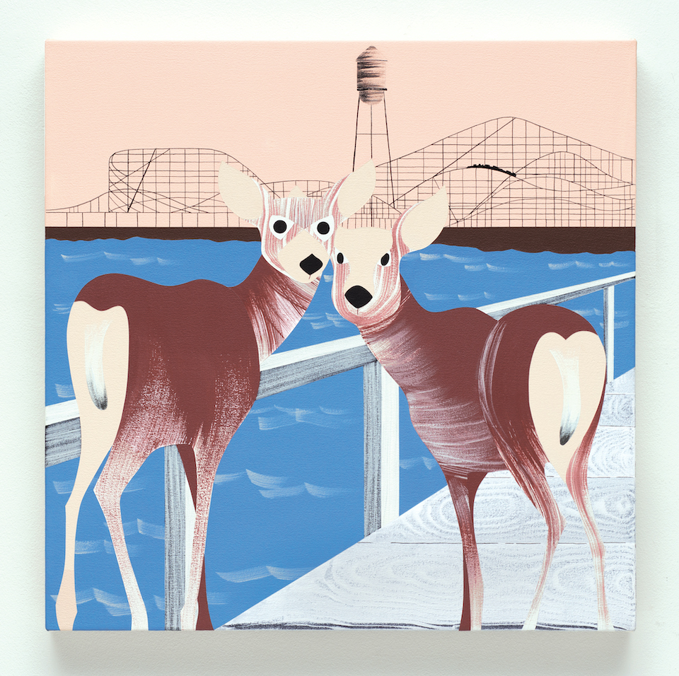 A Los Angeles native, Hilary Baker grew up among Hollywood's film and music industry professionals. She spent her childhood roaming the hills around her home in the canyons, hunting for animal bones and avoiding the occasional snake. Her subjects, ranging from baseball and wildlife to California’s history and landscape, are depicted in her signature graphic style. Known for her dissonant palette, her paintings hint at anxiety and mordant wit with unblinking clarity. Baker’s world is quarried from the strange, poetic, and darkly humorous with the confidence of a painter who is in the game for the long run.