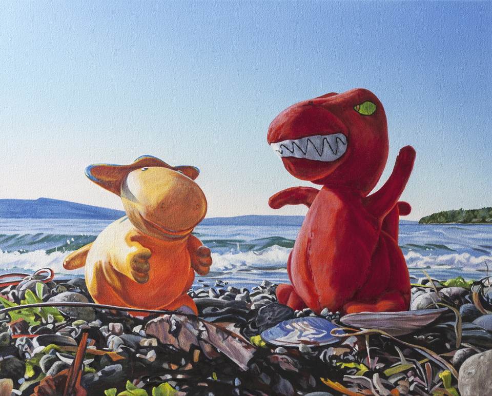 The Watershed paintings are inspired by the incongruity of the man-made detritus found washed up on the otherwise pristine shores near my Discovery Bay WA studio; the plastic shards and PETE water bottles, plastic bags, the mismatched running shoes, the foggy plastic water bottles, the throw-away lighters, the frayed lengths of nylon rope, the spent shotgun shells, to name but a few. I collect this local flotsam as it bobs in on the waves from far and near, and with my ear to the sand for a close view, I pose and photograph it on the beach where it strands. The resulting seascape compositions depict the beach trash as monolithic, thereby providing a visual metaphor for the overwhelming magnitude of the issue of marine debris.