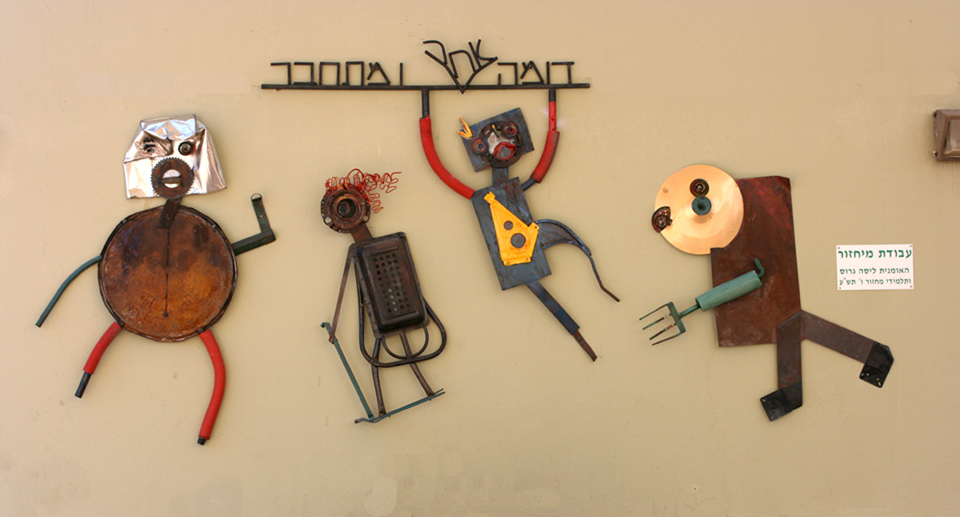 For more than 15 years the basis of my work has been other people's discards. A quick survey of my studio in Azure, Israel, attests to years of foraging for items waiting to be recycled into works of art: abandoned wooden and wicker furniture parts, rusted metal scraps, smashed tin cans, mangled car parts and shattered glass...these are the "found objects" in whose battered forms, contours and textures I see my future sculptures.