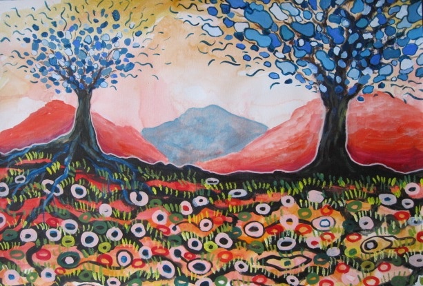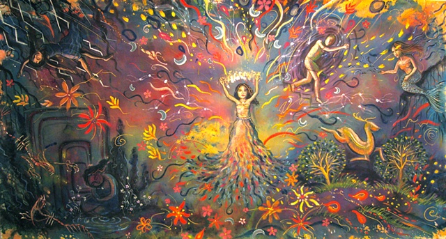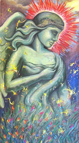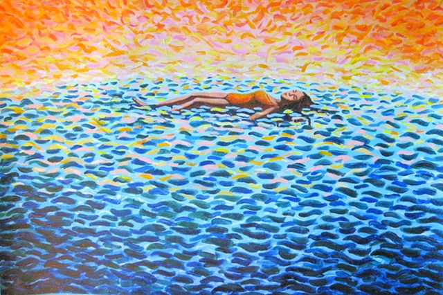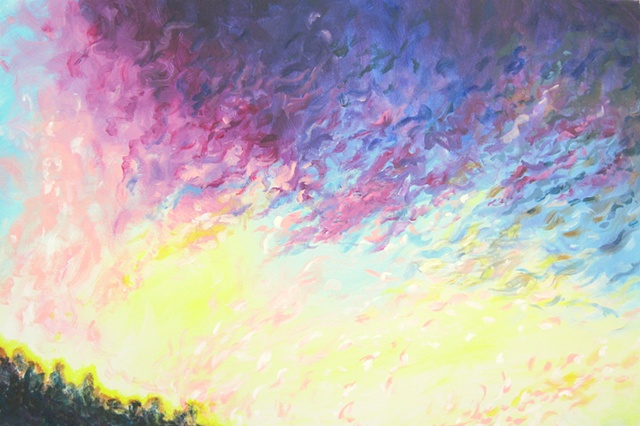 Painting allows me to play and experiment with color freely. I recreate light and reflections with watery paint or layer it heavily to add patterns and texture. Patterns especially excite my senses and make the simplest subject radiate energy. The subjects that I choose are often of the natural world with or without people interacting in them. Natures living energy offers us more than we can see visually, offering to the multitude of vibrations that we cannot always see with the naked eye.