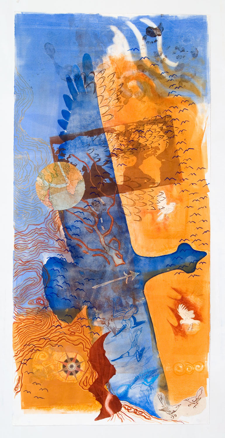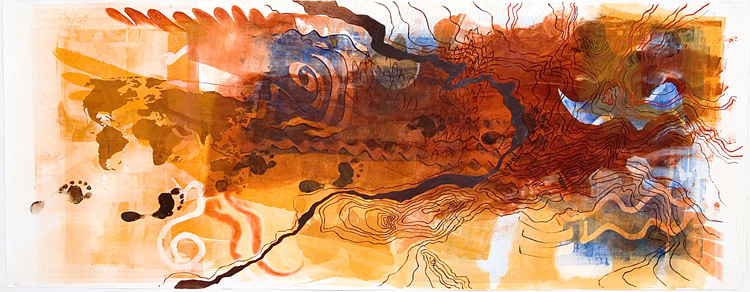 Primarily a printmaker, Joyce has morphed her monoprints and etched plates both into large scale installations and a variety of other forms including animation, books and sculpture. She weaves text, photos and images into the layers of her monoprints on both paper and fabric.