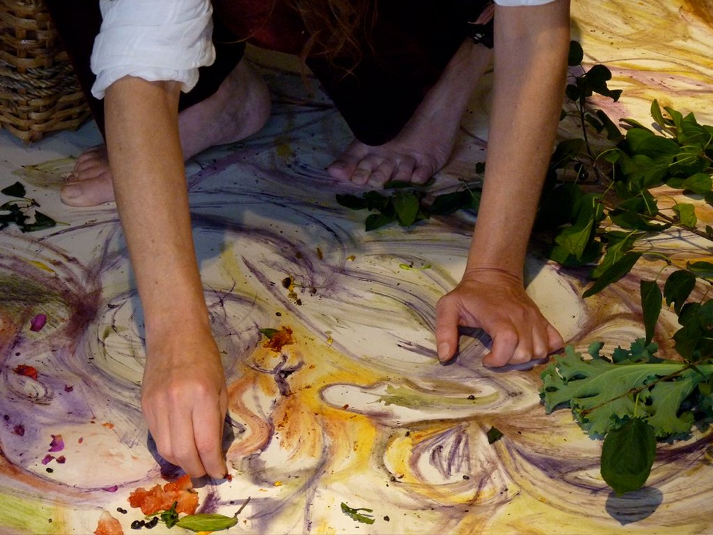 Nicole Fournier is an artist, activist and founder and director of InTerreArt. She has exhibited her art internationally for more than two decades. Since 1996, her art practice has been infused with a concern for the environment. In 2002 she began working with an interdisciplinary approach between art and environment, outside of sanctioned art institution (galleries and museum) with her intervention in a gmo cornfield 'Corn field performances'. By 2004, her art practice become solution based and she began engaging communities in actions and education of alternative agriculture systems (to the industrial based monoculture system) and by 2005 her action were intentionnally to maximize biodiversity with polyagriculture-food-medicine systems, in your own backyard with the project that got her most known 'Live Dining' . Her work has always been about research and the development of concepts, and recently, since 2009 ongoing, she draws with a biodiversity of freshly harvested edible medicinal flowers, fruits and leaves of wild and cultivated plants, conceptually redefining the idea of drawing as a form of eating through absorption through the skin. This conceptual performance she call ' Récolter, dessiner, cuisiner, nourrir' (harvest, draw, cook, nourish).