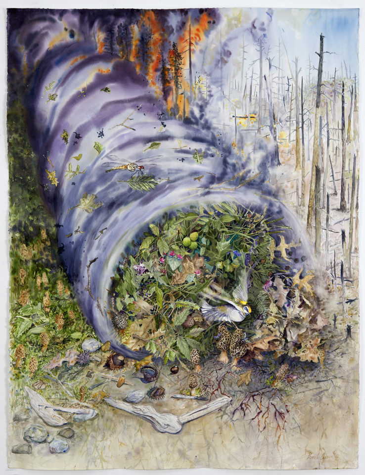 Pamela Casper’s watercolor and oil paintings address humanity’s collision with nature. Casper focuses on the tension between the health and survival of our habitat, our inclination to dominate nature, and the unsustainable exploitation of natural resources.