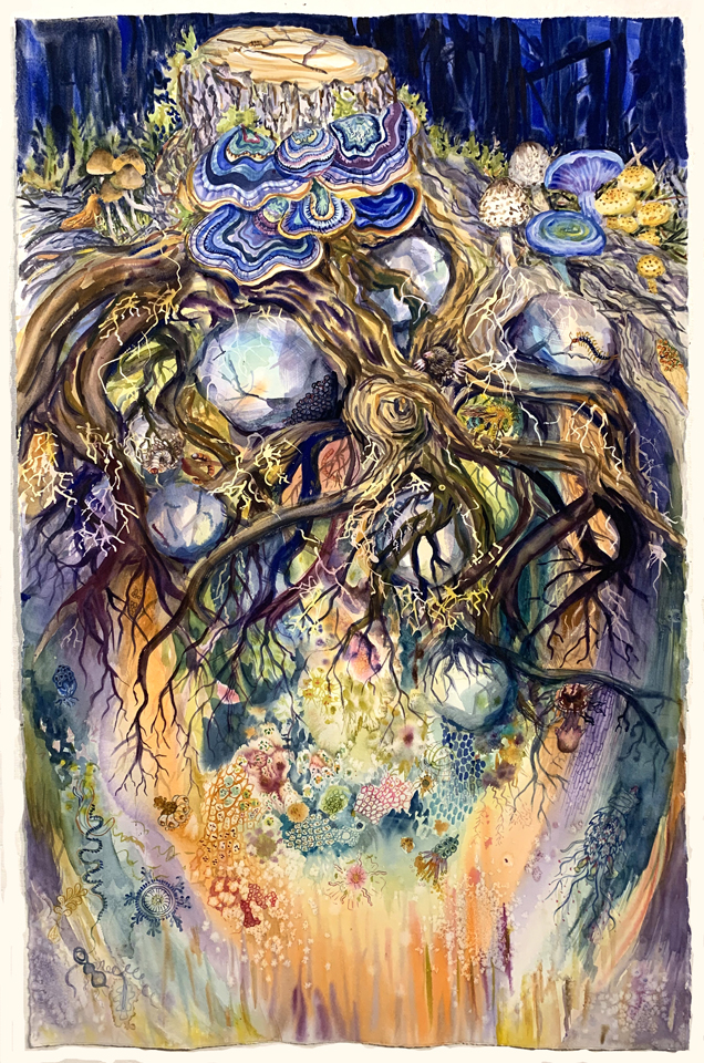 In the “Underground” series, Pamela Casper focuses on the hidden world beneath the surface. This realm includes roots intermingling with fungi, water, creatures, insects, and microscopic organisms that thrive in a cycle of decay and restoration. A lesser-observed world lends itself to a more spontaneous, intuitive, and abstract painting style, conveying soil life's unseen energy and dynamics.