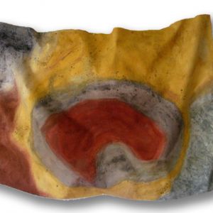 The Earth Paintings are raw-edged artist canvas of textured abstraction in southwestern landscape colors. I have a portable studio,for sustained travel and camping where climate,geology and topography permit long hours of sweaty activity in the open air and access to useable soils. I hammer,crush,sift and prepare the different colors into separate bowls.I spread the unprimed unstretched canvas out on the ground. I sit, kneel, crouch, stand, bend over as I apply the different earths to the canvas with my hands and paint brushes. While painting I loose myself into total focus on the task--feeling the colors, how they wish to be spread on the canvas. When the canvas dries it has a texture similar to leather which gives the painting enough consistency to hold the hills and valleys created as I nail the painting to a frame or directly to the wall. They are signed and dated with the location where painted on the back. The earth paintings provoke reflection, they invite viewers to experience a response to place.