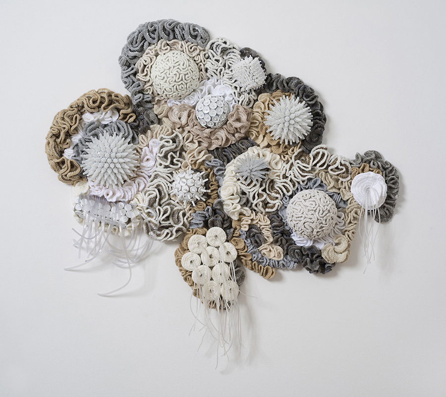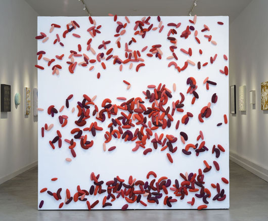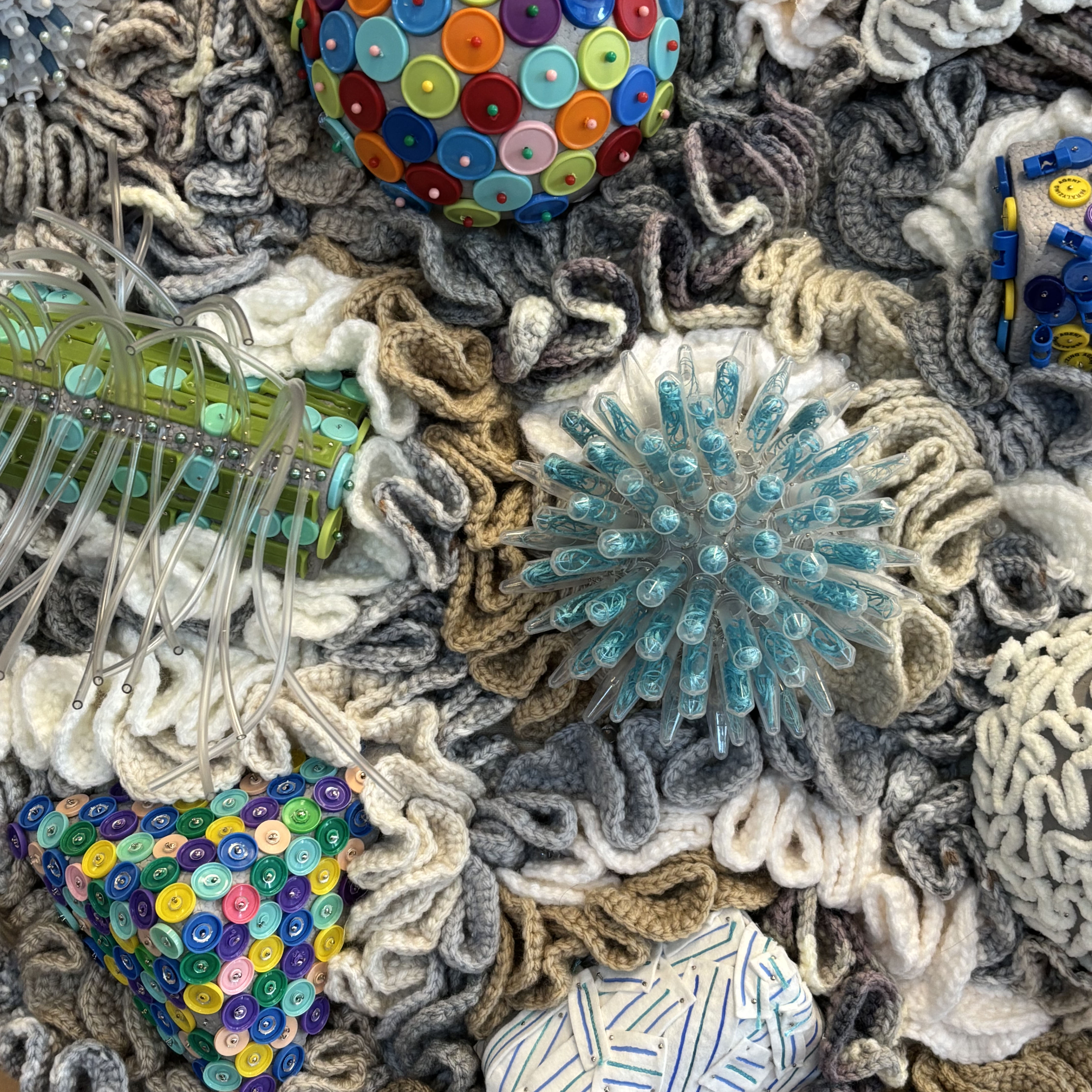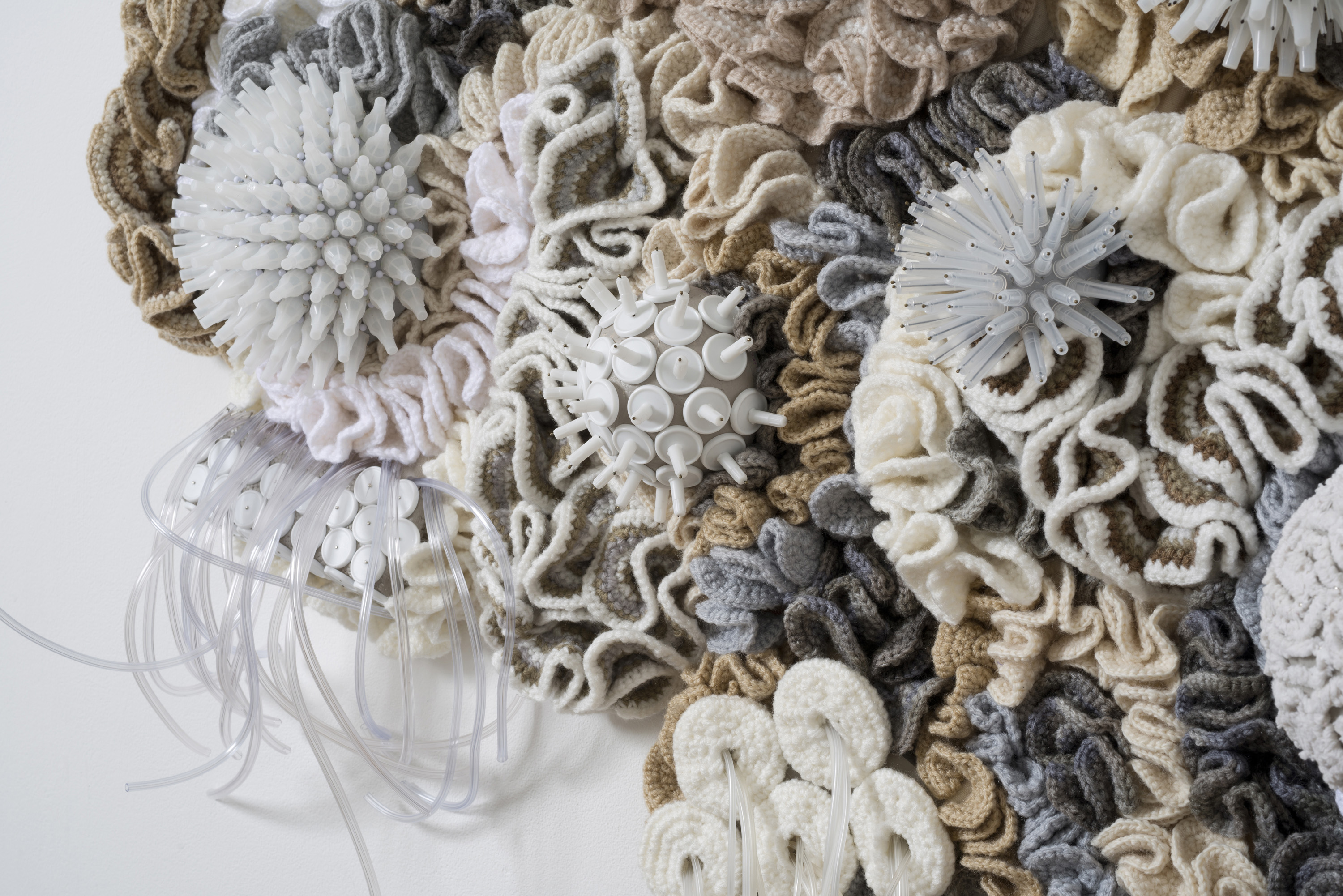 My main body of work references microbiology and microscopy. Formal studies of bacteria, fungi, and viruses lead me to a deep appreciation for their microscopic forms and arrangements. I've found that micro-organisms are best represented by embroidery. One of my themes is a fantasy that bacteria and fungi will adapt to growing on and digesting plastics. If fulfilled, that would start to make a dent in the massive volumes of garbage clogging our oceans and landfills. 'Adapting to New Substrates,' 'Devour,' and 'Thank You' are my realizations of that vision. Bacteria figure prominently in the experiments the Army conducted in the 1950's in the San Francisco Bay Area to study the vulnerability of the population to germ warfare. The Navy injected the bacteria Serratia marcescens into the ocean off the coast of San Francisco where it was aerosolized and blown inland. My installation of wet-felted bacteria, 'Serratia over San Francisco,' is a stylized depiction of that experiment. On learning of the Great Pacific Garbage Patch, I imagined pieces of plastic swirling in an endless gyre. For' Twice the Size of Texas,' an estimate of the size of this gyre 10 years ago, I taped hundreds of small pieces cut from plastic bags to a 10' x 19' wall. 'Colony,' a collaboration with Jessica Cadkin, was prompted by Colony Collapse Disorder. In my early works I used thousands of brewed tea bags scavenged from family, friends, and a weaving school. Hand stitched together, they formed quilts, walls works, windows, and even a dress. 'Extending the Useful Life' celebrates tea bags for warmth, intimacy, and thrift.