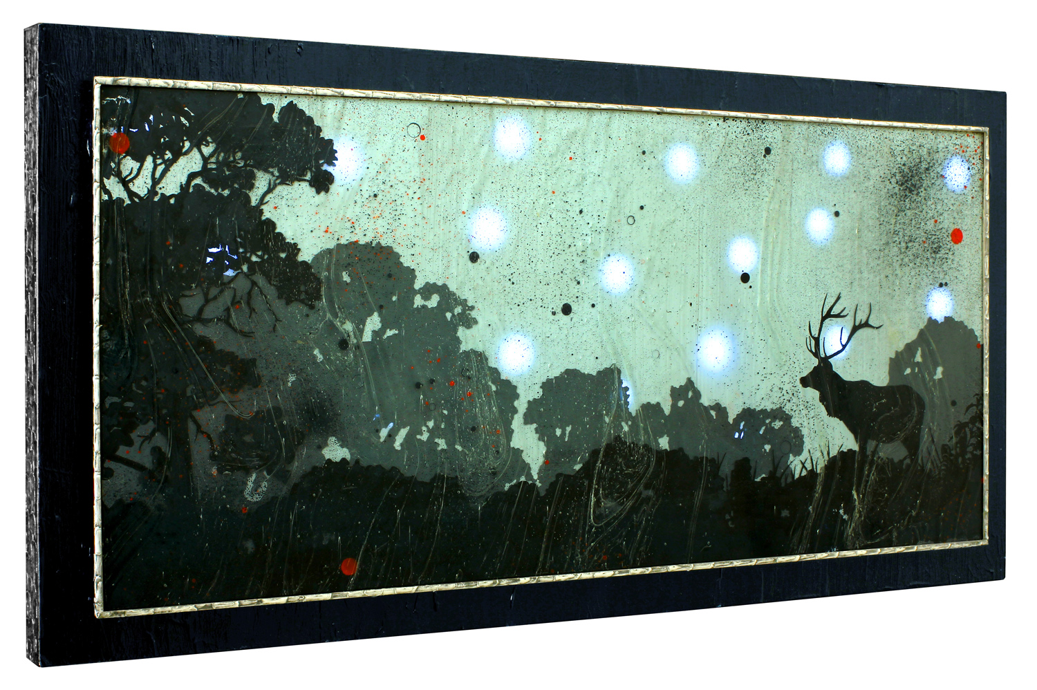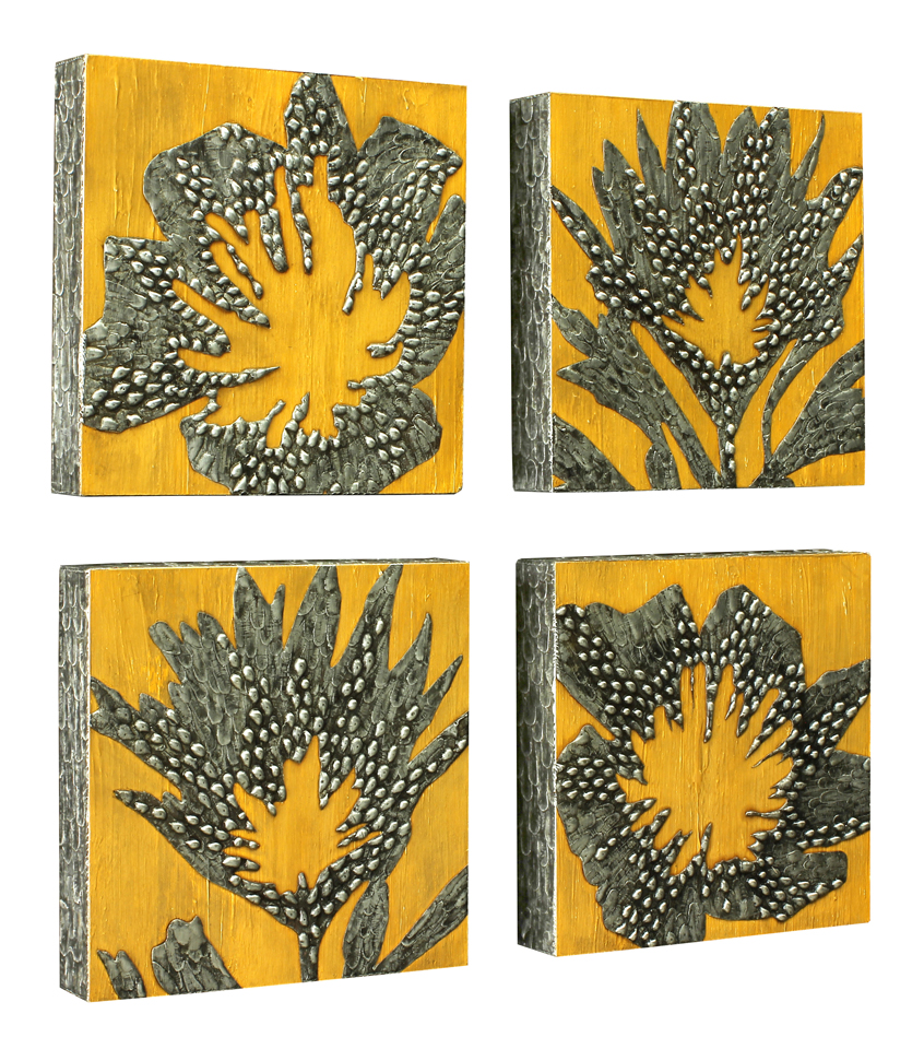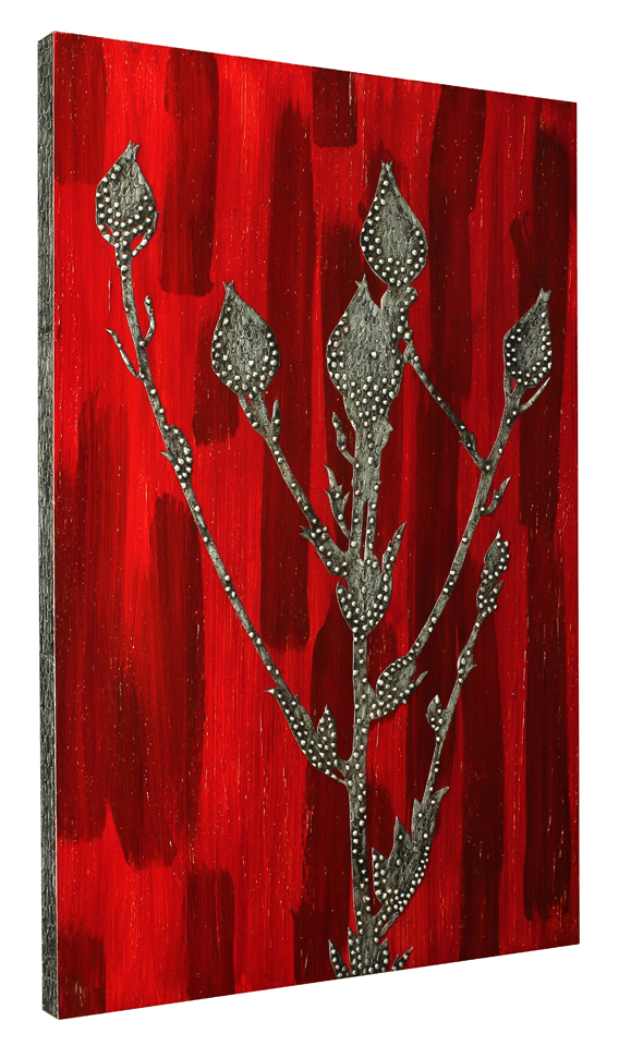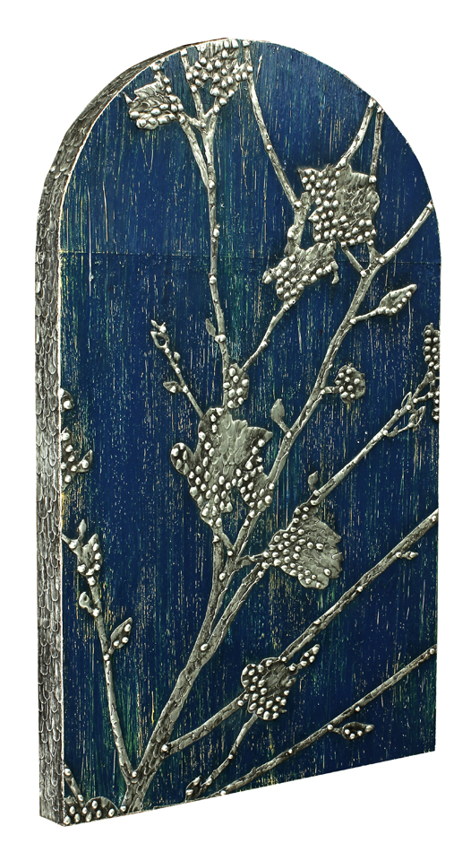 In my metalwork I use the soldering iron as a paintbrush, allowing the hot solder to set into a textured pattern that looks like tree bark. Then I add more dimension to the metal by strategically placing beads of solder to create depth and contrast. The whole piece is covered with a rich black patina, and burnished with steel wool to bring out shining highlights on the raised peaks, while leaving dark in the valleys. Finally, I abrade the painted panels with steel wool to let multiple layers of underpaint peek through.