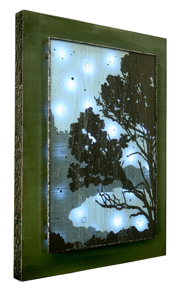 I use the same soldering techniques in my lightboxes, but I overlay the work with thick, clear architectural glass, rich with bubbles and streaks. I use stained-glass techniques in my lightboxes, but I don't use stained glass. As much as possible, I want everything to be made by my own hand. I paint the images with India ink on layers of specially treated Mylar, and stack them behind the glass, giving an illusion of depth. Flip the switch, and tiny lights behind the glass shine like fireflies or stars across the big, bold California sky.