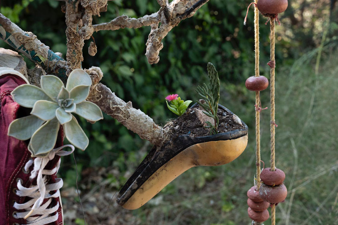 Using throwaways is key to the work’s impact and intention. She honors the integrity and original purpose of these found materials by making use of the innate histories and forms embedded in each fragment. The process is evolutionary, beginning with cleaning, repairing and prep, then figuring how to build and create a work of art. This deliberate process allows for a message or story to surface organically. In the end something new emerges, a work with hints of the familiar juxtaposed with compelling mystery that invites engagement and scrutiny.