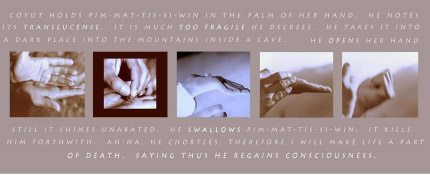 It takes 3000 years to make tumulth, the sacred paint that comes from the life- blood of the cedar tree. 1500 for the tree to grow to maturity, and another 1500 years for it to return back to the Earth from where it came. The paint is used for spiritual protection. Source: Alibhai, Amir. Cross Cultural Collaboration and Community Art Practice: an autobiographical examination (2002) https://circle.ubc/bitstream/handle/2429/11212/ubc 2001-002.pdf