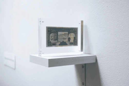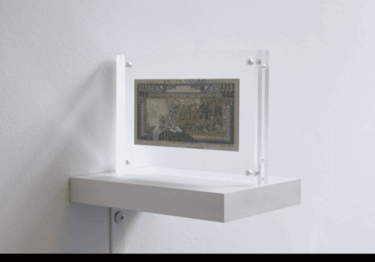 Technique- Material: US $20 paper bill, vinyl film, cardboard, burnt text