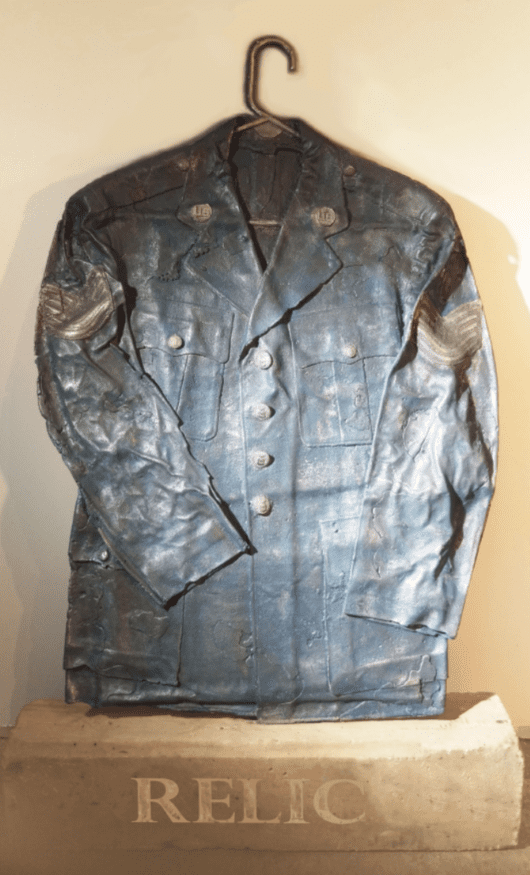 Assemblage artwork portraying the long shadow of war on childhood and whimsy. Exploring the mythology of duty, heroism, glory and the many and varied societal fairy tales that we tell ourselves in order to be able to live with the realities of war. Constructed from my daughters broken jewelry box, my grandfather›s WW2 medals, and a found toy soldier.