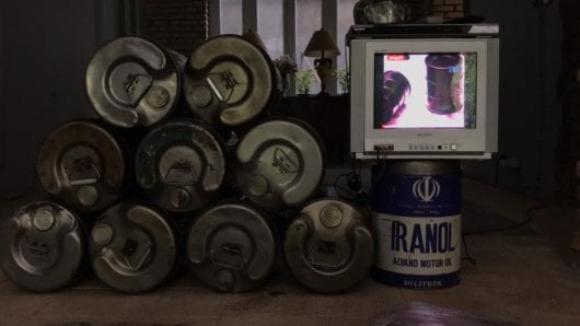The work is formed of an installation using 9 old 20-liter oil barrels and a video projection set. A video of the lines of selling and buying stocks offered by oil production companies in the stock market of Iran is shown. The time designated to the video that is supposed to be played on parts of the body of the barrels is 60 second.