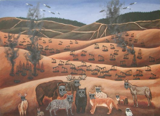 I painted «Land of the Free» right after Hurricane Katrina, when the ramifications of our addiction to fossil fuels – endless resource wars, environmental destruction and greatly intensified weather events – started coming home to roost. The animals in the foreground are victims of humanity›s incessant plundering of the Earth. The Earth is their home, too, but they have no recourse and nowhere to take shelter as our planet is swallowed up by oil production, weaponry, and resource extraction.