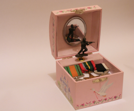 Assemblage artwork portraying the long shadow of war on childhood and whimsy. Exploring the mythology of duty, heroism, glory and the many and varied societal fairy tales that we tell ourselves in order to be able to live with the realities of war. Constructed from my daughters broken jewelry box, my grandfather›s WW2 medals, and a found toy soldier.