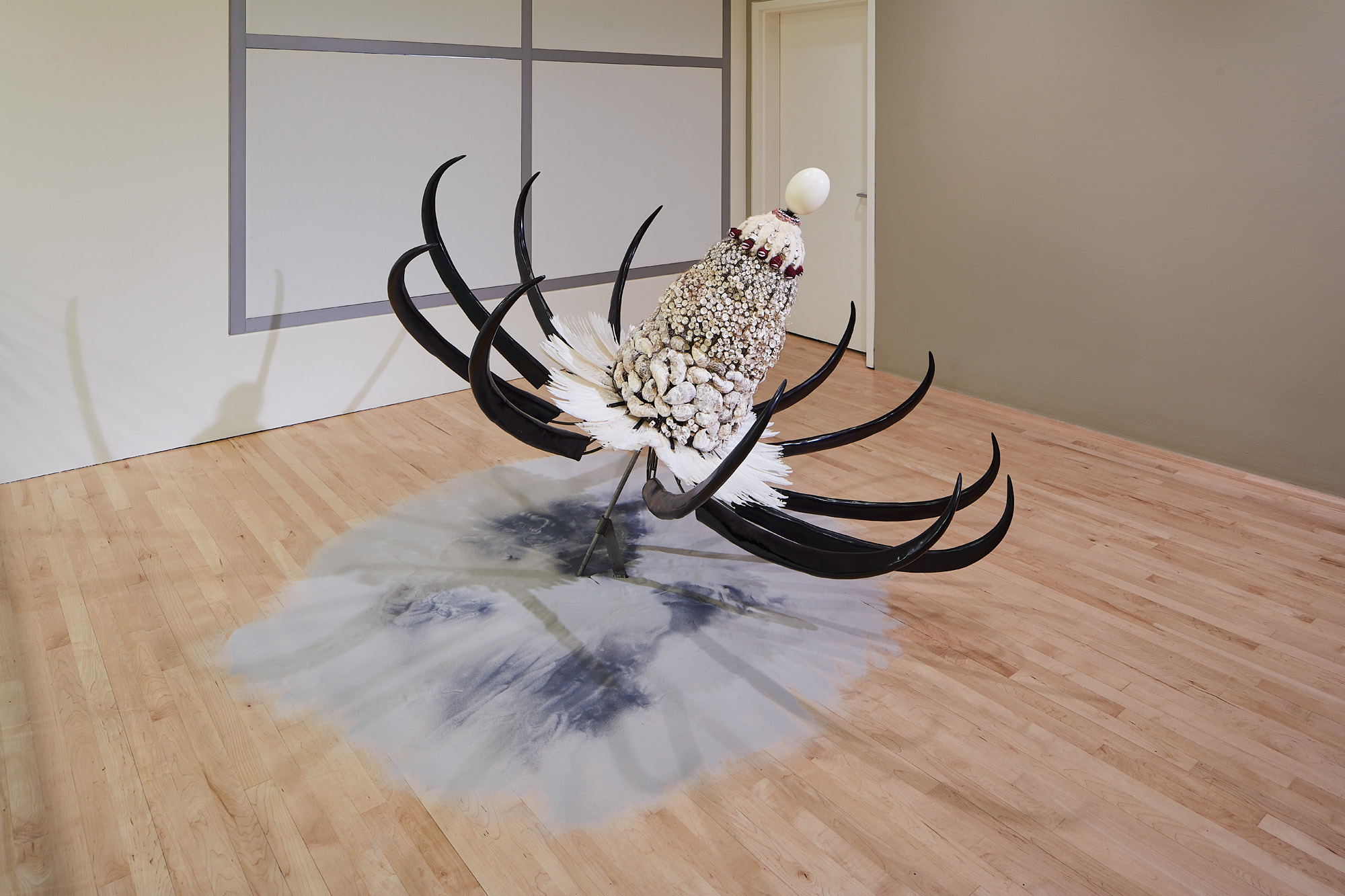 Oyster shells, fish bone, thread, cowrie shells, fur, deity eyes, copper trim, ostrich egg, epoxy American buffalo horns, steel, fabricated umbrella structure, steel stand, pigeon-feather fans, 21⅝ × 61 × 78⅜ in., 2009, Installation view Fowler Museum at UCLA
