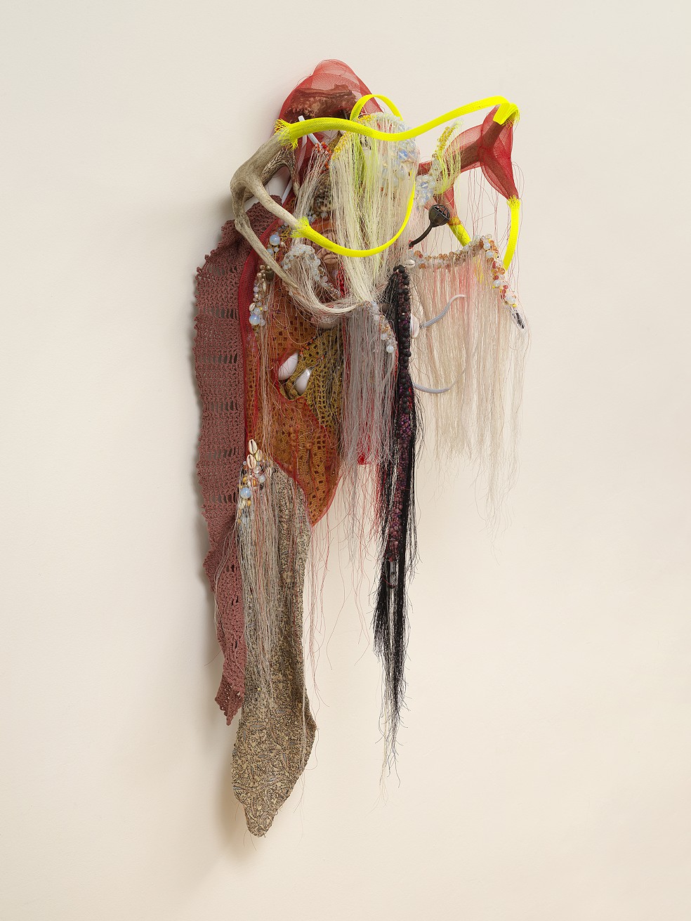 The piece is ripe with medical residue: plastic tubing, latex and rubber gloves. The tubing underscores the phenomena of transmission, referencing both the transmission of medicines, as well as the global movement of people, goods, and disease via colonization, enslavement, immigration, or trade. The piece also contains elements of or associated with the human body such as fake fingernails and eyelashes, highlighting the human beings impacted by both disease and persecution.