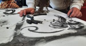 An image of the Manawa Forest was used as a key compositional framework to evoke connection to the Hokianga landscape, meant to help participants feel their way into contributing to the collective visual terrain. The workshops made use of simple materials that were safe to handle and durable enough to withstand the rigors of the program. The materials included a primed canvas roll (10 meters by 1.5 meters) and home-made charcoal from the local Manawa (Fig. 4). The Manawa also proved to be a valuable means for initiating discussion due to its cultural significance as a symbol of strength and endurance, and connection between humans and their environment .