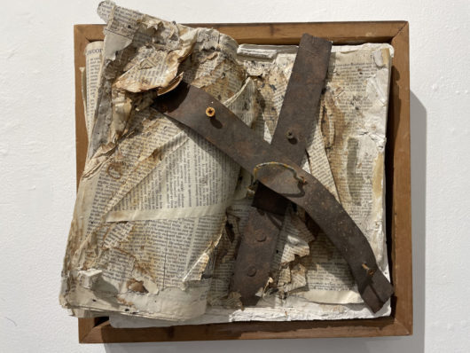 Mary’s paintings and assemblages owe much of their meditative atmosphere to the forest and the solitude you experience living among the trees. The mineral quality of the Southwest landscape is also present. Her artwork of the past few years, acrylic and mixed media paintings on canvas and assemblages of found materials, incorporates pages from old books, cloth from worn clothing, minerals including raw ocher, with found fragments from our industrial wasteland mixed in.