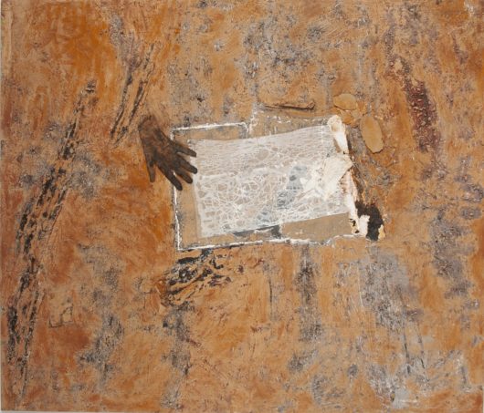 Another element in Mary’s work is layering. This can refer to the physical process of making. As Mary describes it: layering is the process of painting on, scraping off, painting on again, etc. In addition, layering also describes the combining of materials, cloth over paint, paint over sand, over crushed pigment – techniques that give her paintings a solidity akin to naturally occurring rock surfaces, a quality of embeddedness and weathering that points to the dimension of time