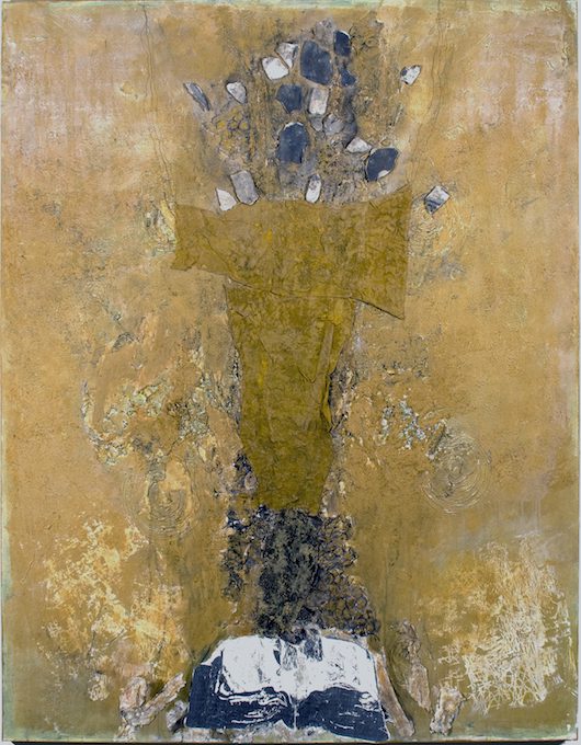 “The study of Alchemy has for many years informed my work, particularly in the processes used to make the work. The evidence of burning, exposure to water and air and the inclusion of earth and ash are part of the art making process. The process of layering paint, organic materials and objects and the rough surfaces that result bring the notion of time and endurance to mind. The book images that are often included are battered cultural artifacts that reflect a human presence that may or may not be relevant to the world of nature.