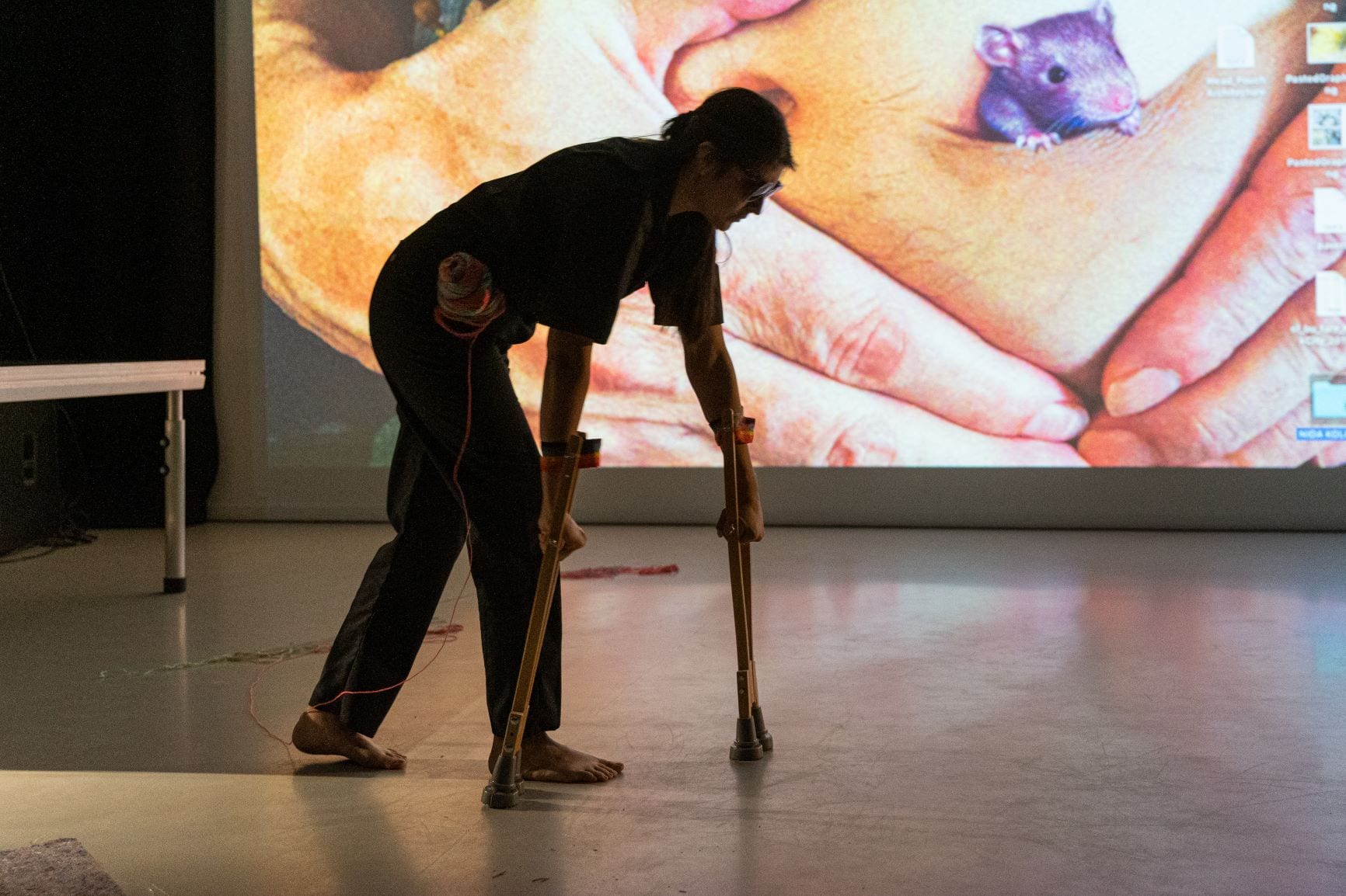 In the recent performance Coming Out as a Trans*Animal: The Sympoietic Affects of We Architectures performed at Nida Art Colony’s 9th Interformat Symposium on the Fluidity of Humour and Absurdity in Lithuania, I opened the experience with a sound performance against a video backdrop, the throbbing rainbow warp zone joined an amplified vocoder that surged with technological transmutations of crow and raccoon calls, chanting of mantras, and a voice that shifted from robotic to high and low pitched registers affirming “I am not a man, I am not a woman, I am not a human.” With eyes veiled, I slowly walked around the venue with Quadruped Prosthetics, descending from human primate’s signature bipedal stance to an inclined pose, centering myself and bending to sit into the crutches. I stepped first with my right hand, followed by my left foot, and then my left hand followed by my right foot, remembering and aspiring towards without mimicking the weighted grace of an orangutan or an elephant, attempting to focus on a point in front of me in the darkness, trying to forget the gaze of my audience as I sought to sink into the rhythm of this new gait. A spindle of yarn spilled from my side, tracing my movement and purposefully binding the audience in a loop of rainbow colored fibers, a flexible architecture, a closed circuit, a knotted network, a constellation of shared space and time. Without telling the audience I put a magic spell on them I sealed it with laughter, requesting a collective healing for our learned anthroposupremacy.